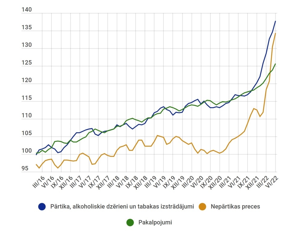 Savukārt 2022.gada jūnijā, salīdzinot ar 2021.gada jūniju, lielākā ietekme uz vidējā patēriņa cenu līmeņa izmaiņām bija cenu kāpumam ar mājokli saistītām precēm un pakalpojumiem, pārtikai un bezalkoholiskajiem dzērieniem, ar transportu saistītām precēm un pakalpojumiem, restorānu un viesnīcu pakalpojumiem, dažādu preču un pakalpojumu grupā, ar atpūtu un kultūru saistītām precēm un pakalpojumiem, alkoholiskajiem dzērieniem un tabakas izstrādājumiem, veselības aprūpei.