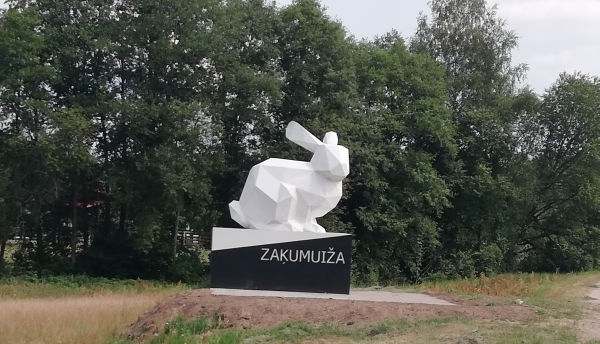 Robežzīme, ko rotā liela, balta zaķa figūra, nepārprotami vēsta – esam iebraukuši Zaķumuižā.