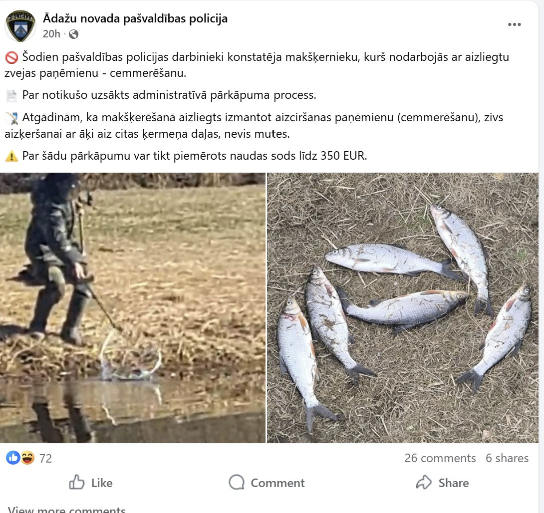 Kā liecina Ādažu novada pašvaldības policijas ieraksts "Facebook", vakar viņiem izdevies pieķert makšķernieku, kurš nodarbojās ar aizliegtu zvejas paņēmienu - cemmerēšanu.