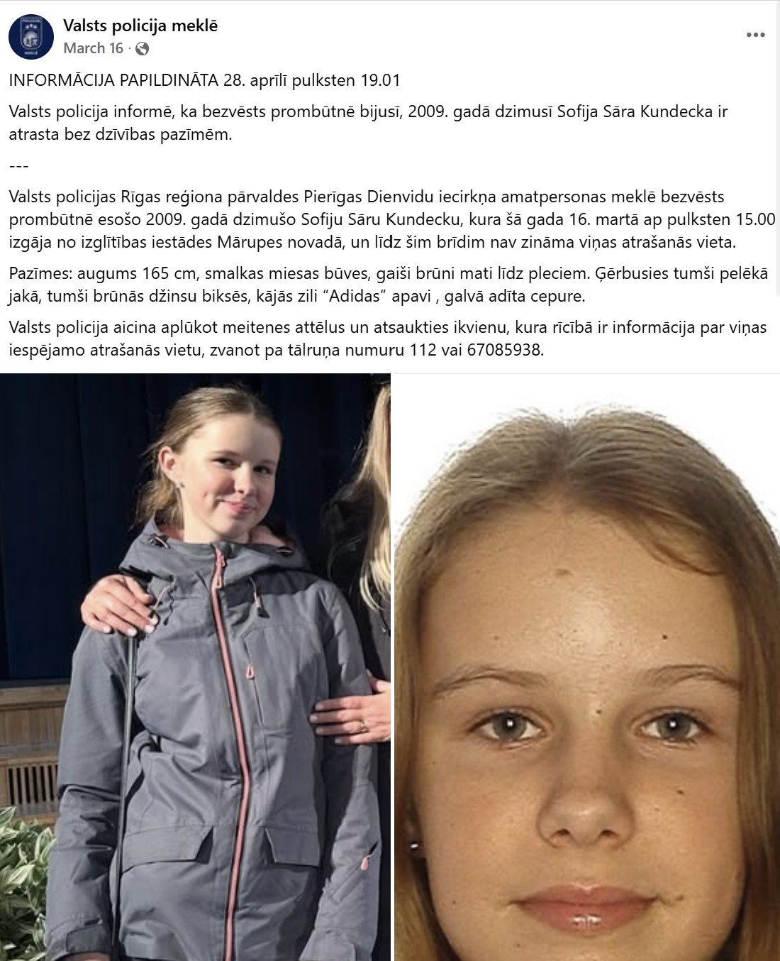 Jau iepriekš policija ziņoja, ka 2009. gadā dzimusī Sofija Sāra Kundecka pēdējo reizi redzēta 16.martā ap plkst.15.00, kad viņa izgāja no mācību iestādes Mārupes novadā. Tika ziņotas viņas pazīmes: : augums 165 cm, smalkas miesas būves, gaiši brūni mati līdz pleciem. Ģērbusies tumši pelēkā jakā, tumši brūnās džinsu biksēs, kājās zili “Adidas” apavi , galvā adīta cepure.